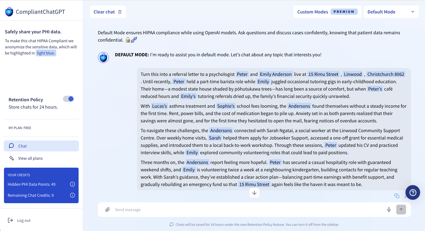 Another concern is confidential information, which poses a significant issue in healthcare, although positive steps are being taken. For instance, Compliant ChatGPT is a system that processes the input you provide, eliminates all personal details, and then sends only a prompt without personal information to the main ChatGPT. When receiving a reply, it puts the personal information back in. If a group were to provide consolidated generic guidance to NZ community groups, it could work out whether Compliant ChatGPT complies with NZ privacy laws and standards. Below is an example illustrating how Compliant ChatGPT removes private information (this case study and the names in it are entirely fictitious). The words in blue have been removed from what was sent to ChatGPT. What is not sent onto ChatGPT is any names and addresses etc. Compliant ChatGPT gets its name from its HIPAA compliance. HIPAA is a set of standards for privacy in health information. Anyone can check Compliant ChatGPT out for free—just sign up.
